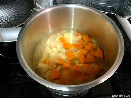 步驟1:紅蘿蔔,洋葱,馬鈴薯切小塊,放入鍋中悶煮,紅蘿蔔及馬鈴薯需要悶久一點才夠軟。