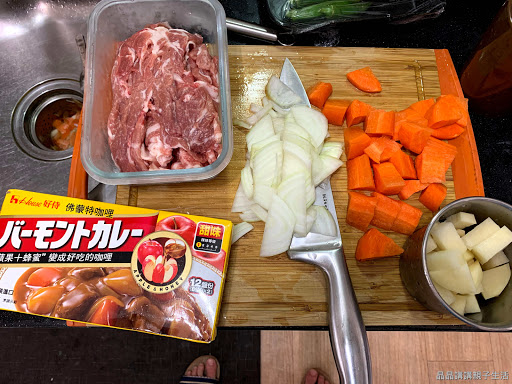 材枓:梅花豬肉片X10,佛蒙特咖哩塊半盒,紅蘿蔔X1,洋葱半顆,馬鈴薯半顆(另半顆被我們做署餅吃掉了,不然一顆比例較適合)。